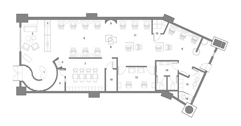 理發(fā)區(qū)是一個全開放的區(qū)域。整齊劃一的座位排布,形成規(guī)整的序列,搭建起理發(fā)師展現(xiàn)精湛手藝的舞臺。佇立在在舞臺中央的藝術雕像和懸掛在天花下的球體燈飾,則在打破這種均質關系,為整個空間注入靈動的藝術氣息。燈光照明上,設計師采用了盡量克制的方式,以理發(fā)區(qū)中央的管形藝術吊燈來提亮空間,使顧客能夠沉浸在柔和的氛圍之中。