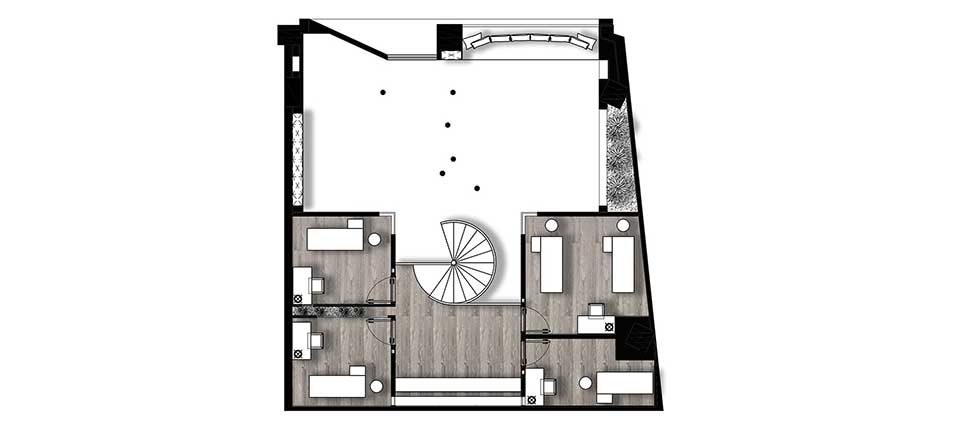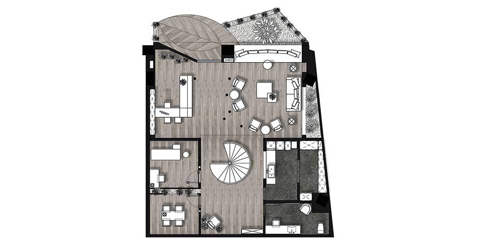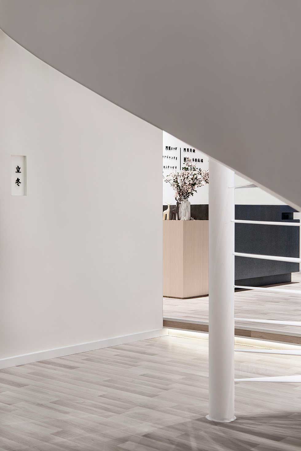 整個(gè)空間入口及休閑區(qū)做了一個(gè)抬高,將空間的公共區(qū)域和內(nèi)部區(qū)域做了一個(gè)劃分。整個(gè)空間的中心點(diǎn)是連接一二層的飄帶狀旋轉(zhuǎn)樓梯。