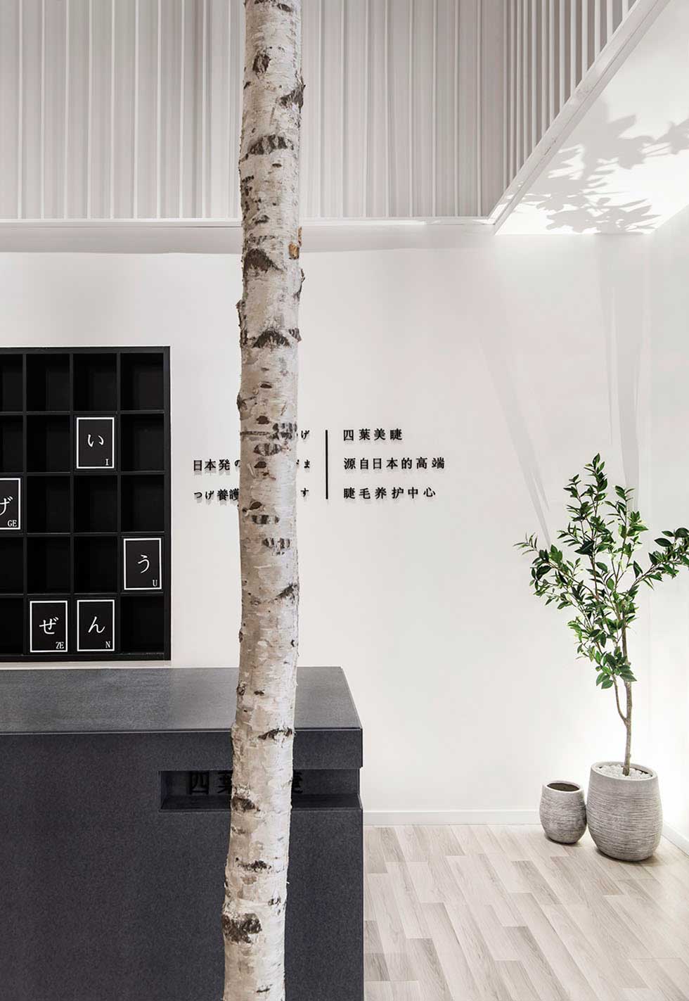 “有一株白樺,立在我窗旁,覆蓋著積雪,像披著銀霜?!??設(shè)計(jì)師將自然引入室內(nèi)空間、大片白墻比作積雪,一片白樺林分割了前臺(tái)與休閑區(qū)。巧妙的設(shè)計(jì)使空間充滿純潔,朦朧,充滿寧?kù)o的美。