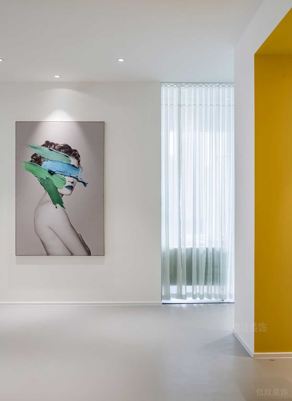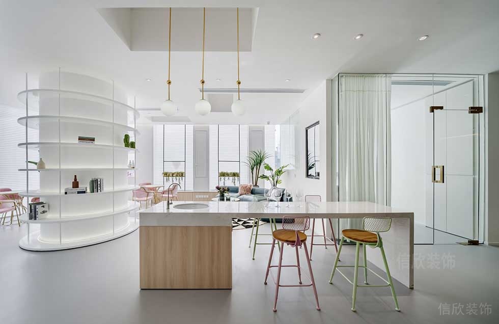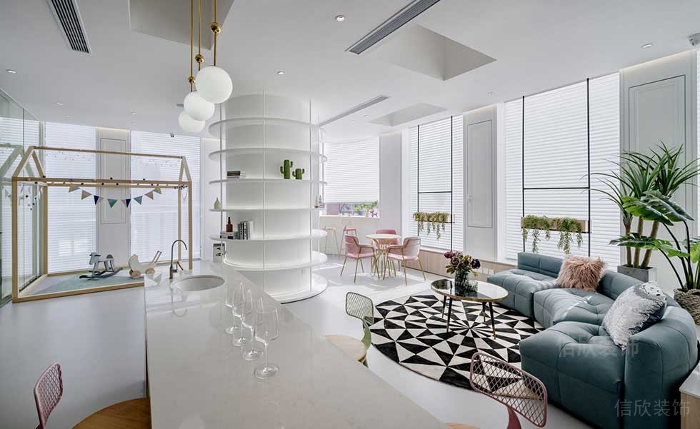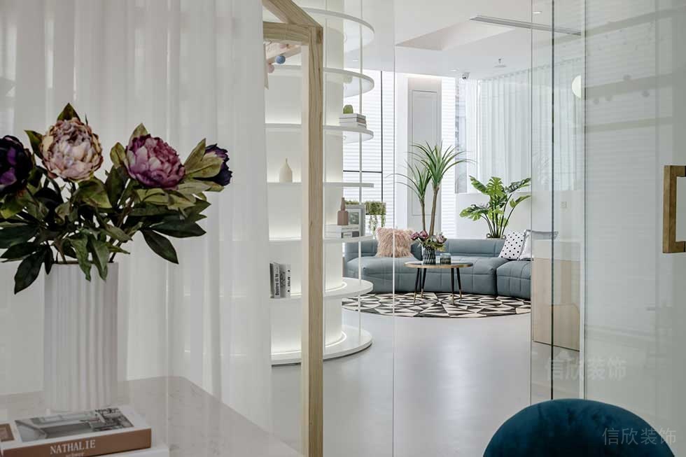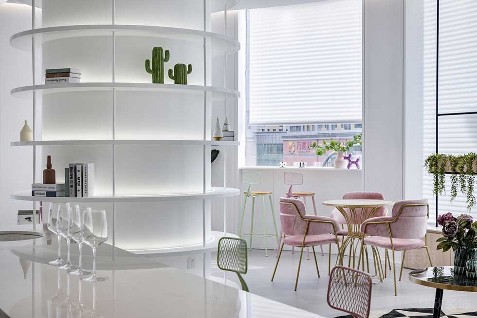 大廳的設(shè)計(jì),采用現(xiàn)代主義極簡風(fēng)的理念,純白色為主體,輕裝修重裝飾的軟裝搭配方式,圓形的柱子作為書架,沿窗邊設(shè)置沙發(fā)和休閑椅的休息區(qū),打造出美觀實(shí)用的高端感覺。