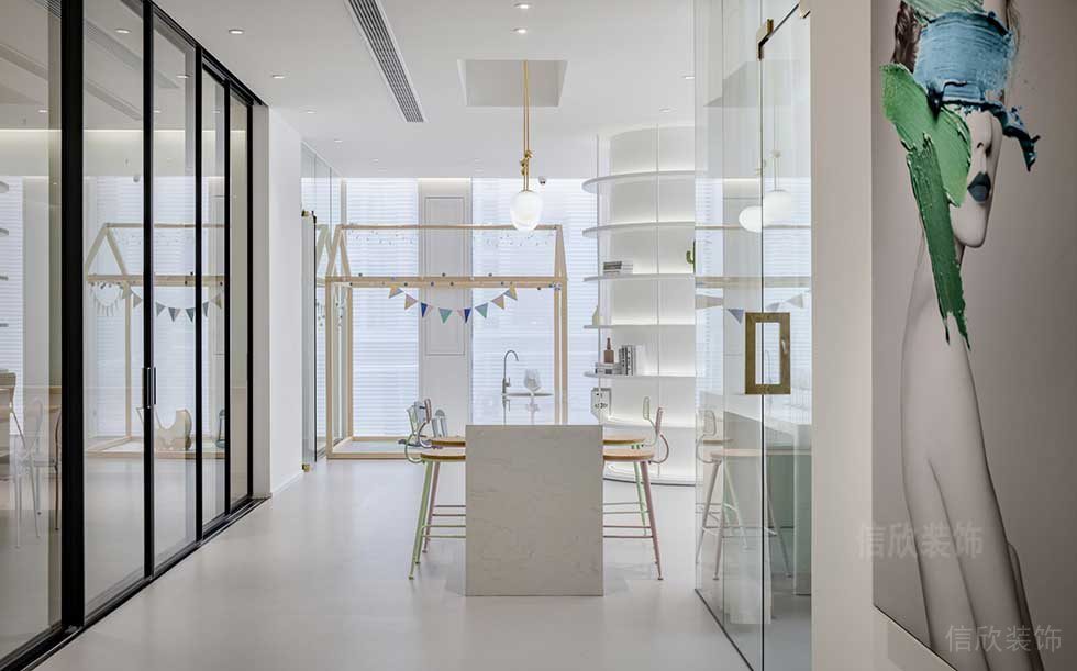 中島臺(tái)代替?zhèn)鹘y(tǒng)前臺(tái)的設(shè)計(jì)方式,多了一份創(chuàng)意和休閑的感覺,讓客戶一進(jìn)來似乎感覺是來喝咖啡,朋友聚會(huì)一樣,拉進(jìn)彼此之間的距離,消除隔閡,快速走進(jìn)客戶的心里。