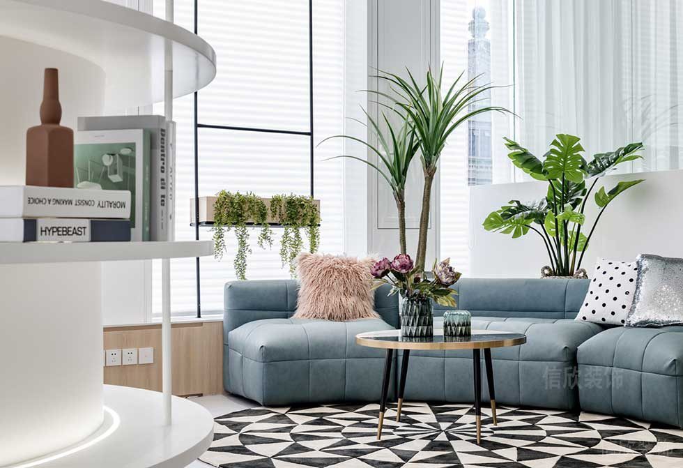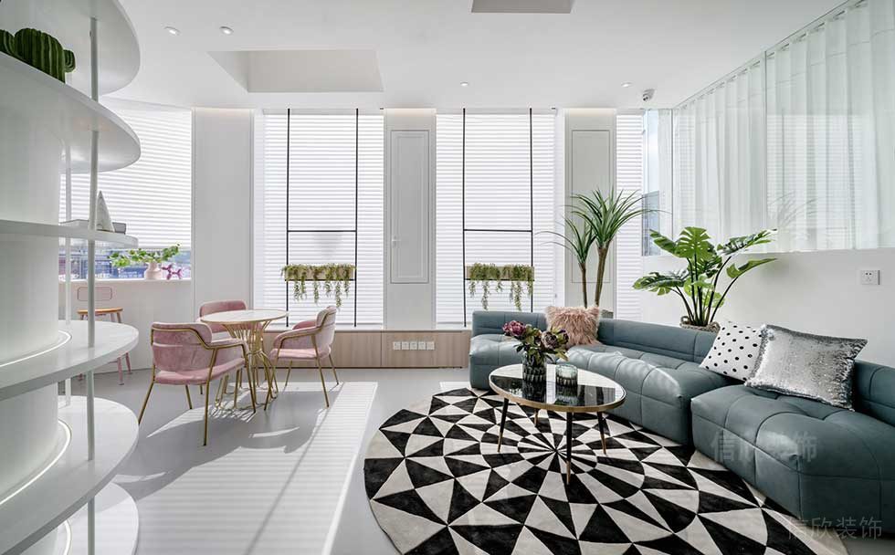 弧形的沙發(fā)沿著窗邊倚靠,保證了光線非常高的飽和度和清晰的空氣,黑白色不規(guī)則排列的地毯,增添了幾分立體的感覺,在休息和洽談中,多了幾分美感和愜意。