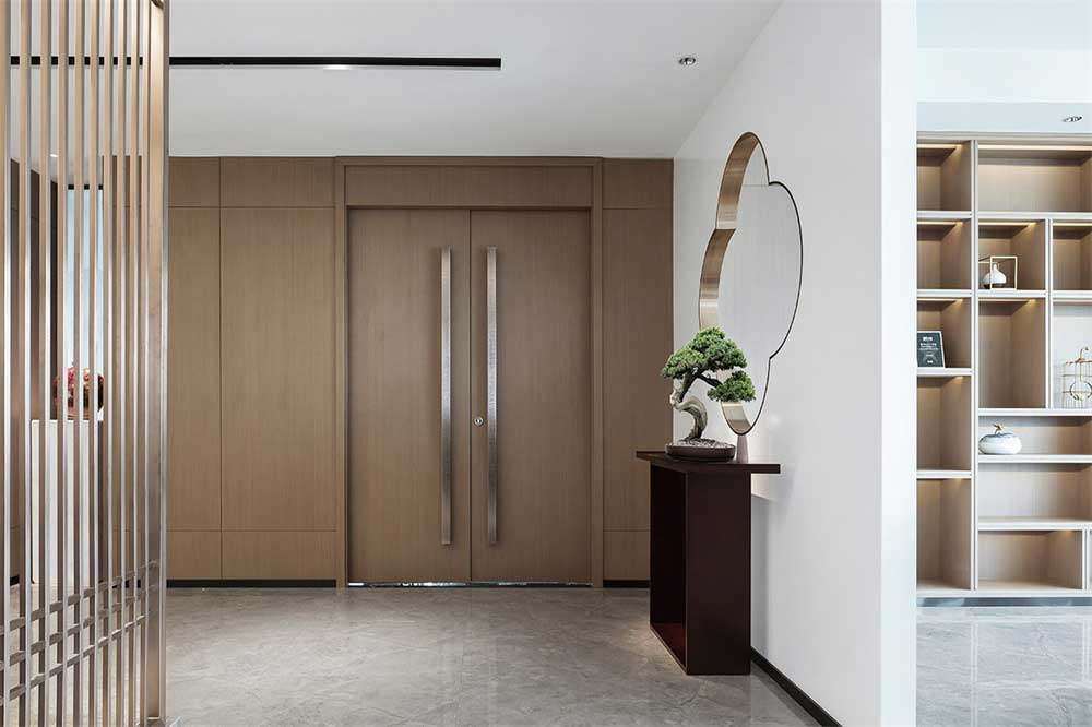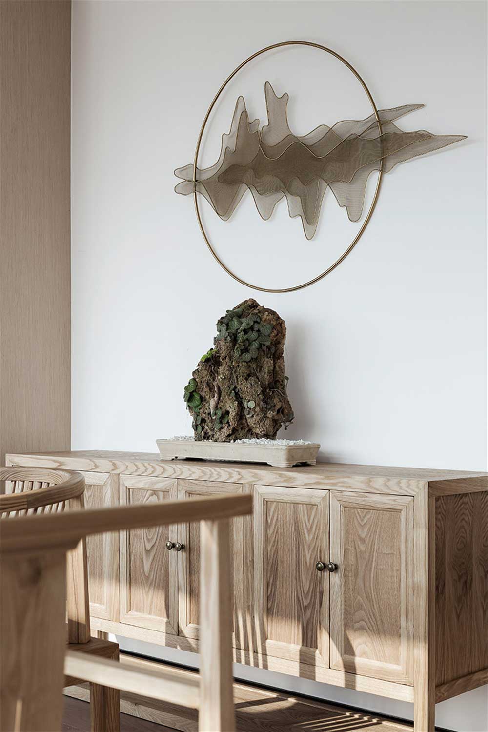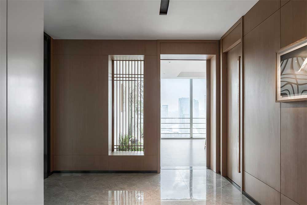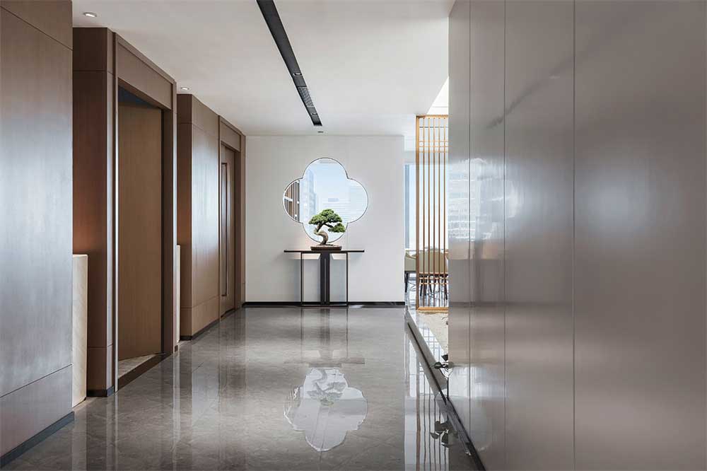 前廳空間以灰色大理石地面,白色大理石背景墻,淺色木紋的護(hù)墻板,平頂和周邊頂相結(jié)合,木材與石材結(jié)合的前臺(tái)等元素,構(gòu)建出一個(gè)簡(jiǎn)單大氣,又儒雅內(nèi)斂的新中式主義前廳設(shè)計(jì),兼具了美感與實(shí)用性。入戶的過(guò)道,采用木紋護(hù)墻板和門一體式的設(shè)計(jì)看起來(lái)風(fēng)格更統(tǒng)一,室內(nèi)的枯山水景觀,鏤空式的墻體的玄關(guān)柜則體現(xiàn)中式古典文化的內(nèi)涵。會(huì)議室和吧臺(tái)區(qū),以護(hù)墻板穿插中式山水畫的巧妙點(diǎn)綴,讓空間更飽滿,更有古風(fēng)的氣息。辦公室以長(zhǎng)條形的實(shí)木和平頂?shù)慕Y(jié)合,使延伸感更強(qiáng)。洽談區(qū)選擇在落地式窗戶的前臺(tái),擺放上實(shí)木的家具和泡茶桌,采光和采景效果最好,一邊喝茶一邊欣賞美景,符合了唐詩(shī)中“會(huì)當(dāng)凌絕頂,一覽眾山小”的豪邁氣勢(shì)。