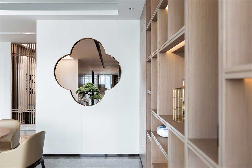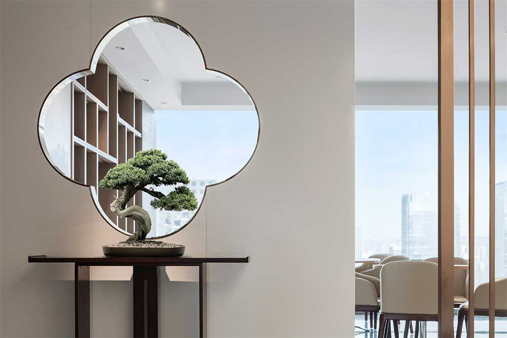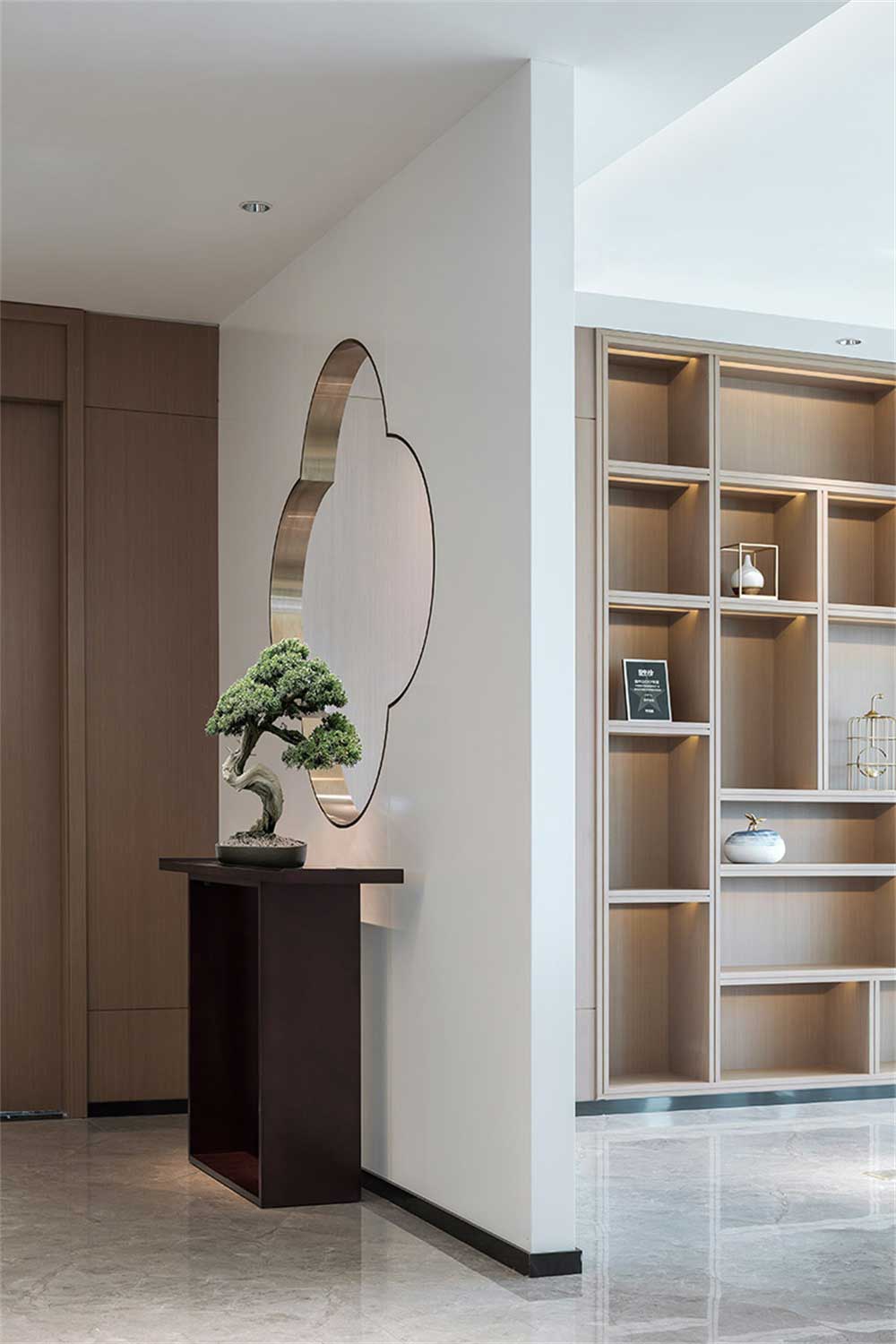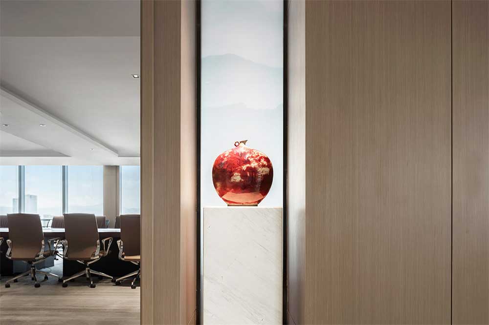 深圳市寶安1000平國(guó)中創(chuàng)投辦公室裝修會(huì)議室,中式月門的設(shè)計(jì),兩邊做天然大理石瓷器展臺(tái),更有古典文化底蘊(yùn)。