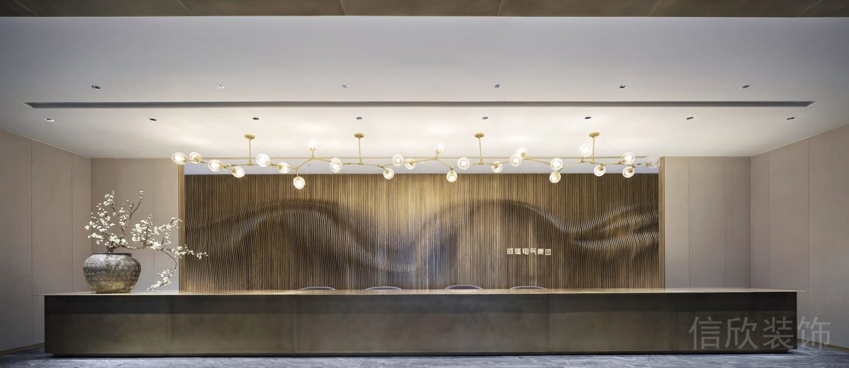 輕奢風(fēng)格通常包括簡潔、優(yōu)雅的設(shè)計元素,可以在前臺區(qū)域使用白色大理石地臺設(shè)計。