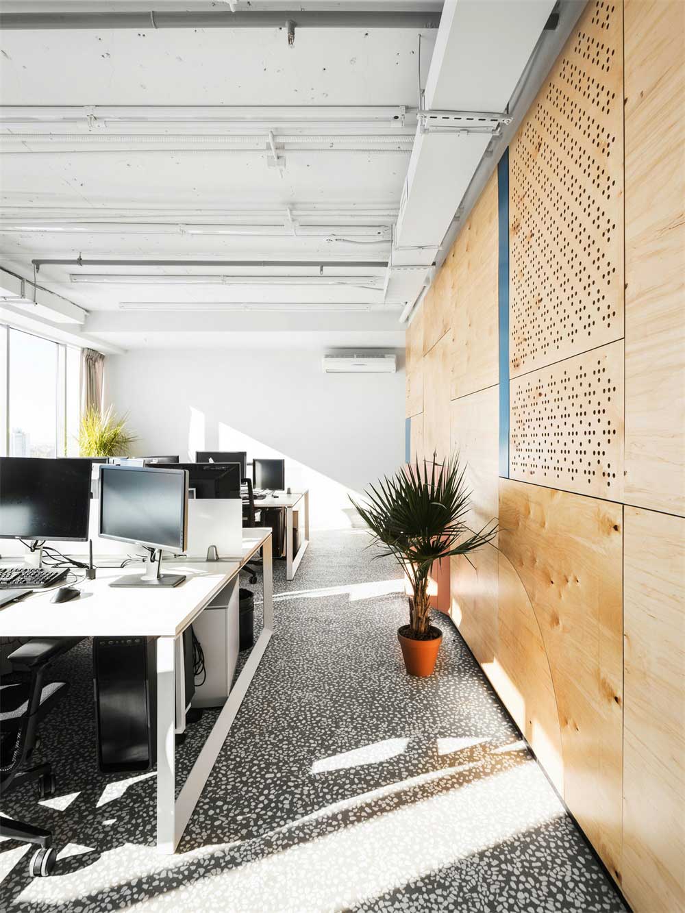 游戲公司辦公室走廊,刻意裸露的管道,和原木紋的墻面,凸出原始自然和工業(yè)感的特點(diǎn)。