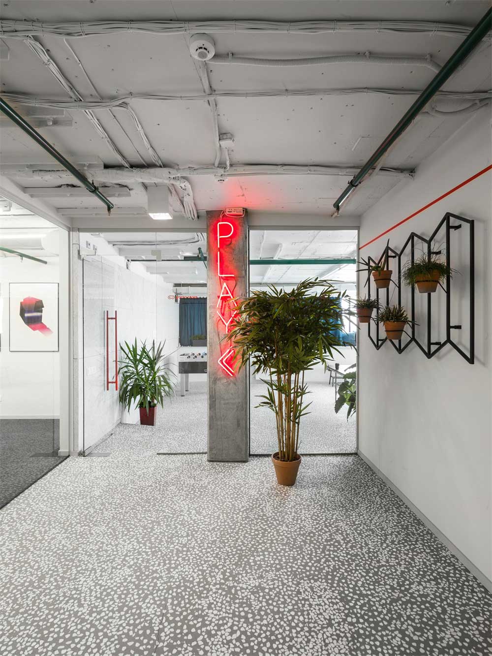 設(shè)計(jì)理念:本案是一所現(xiàn)代風(fēng)格的游戲公司辦公室裝修設(shè)計(jì)案例,游戲公司的辦公室,因?yàn)槠洫?dú)特的工作環(huán)境,需要?jiǎng)?chuàng)意和流行感兩者合一,符合年輕人的審美特點(diǎn)和喜好,同時(shí)充滿了酷炫和陽(yáng)光的氣場(chǎng),利于思維的發(fā)散,不會(huì)被環(huán)境緊固了想象,明快的節(jié)奏和工作的激情,如同我們?cè)谟螒蚶锊珰⒁粯樱肋h(yuǎn)的專(zhuān)注,永遠(yuǎn)的年輕,不分年齡階段始終可以被那種緊張和刺激的氛圍所感染和帶動(dòng)。入戶的位置,地面和頂面沿用了以前的原始結(jié)構(gòu),星點(diǎn)的水泥地面,有種復(fù)古的感覺(jué),白色的原始頂面和裸露在外的線管和燈線,充滿了工業(yè)風(fēng)的冷峻感。不同形狀的霓虹彩燈,則是街頭文化的特點(diǎn),狂野而前衛(wèi),原木風(fēng)混合不同顏色的小隔間設(shè)計(jì),不規(guī)則分隔的地毯,黑色通明玻璃的會(huì)議室,讓一切始終走在時(shí)代的前沿,但又區(qū)分于流行的元素,對(duì)生活,對(duì)時(shí)尚有著自己獨(dú)特的思維方式,和認(rèn)知的理念。