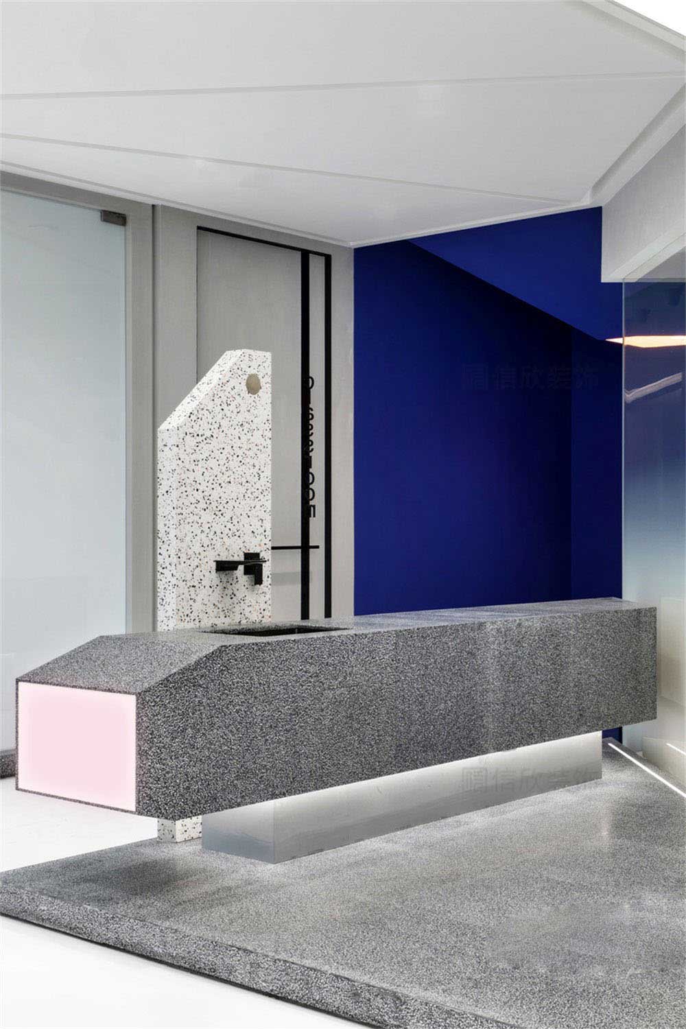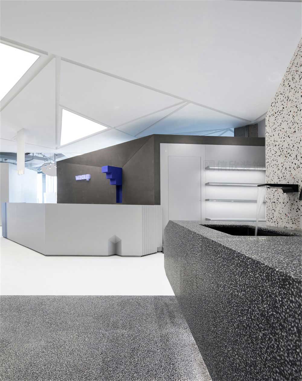 前臺(tái)的設(shè)計(jì)上,采用了立體圖形拼接的方式,設(shè)計(jì)新奇獨(dú)特,創(chuàng)意十足,黑白灰藍(lán)四種顏色為基調(diào),把多個(gè)立體造型,組合為一個(gè)藝術(shù)感十足立體圖形。