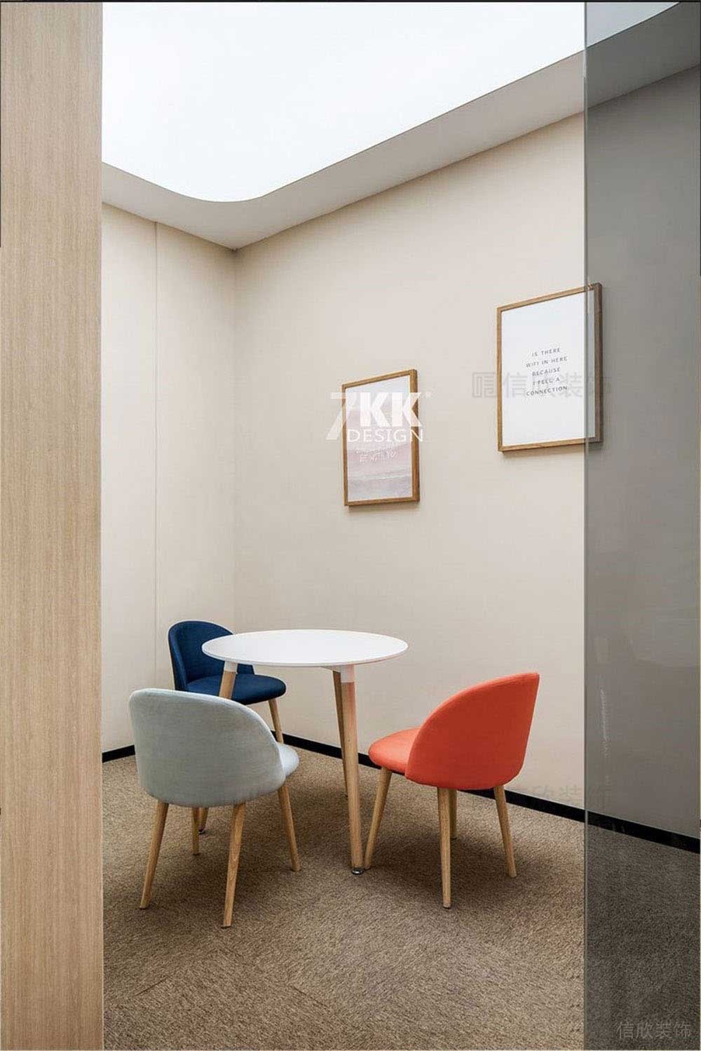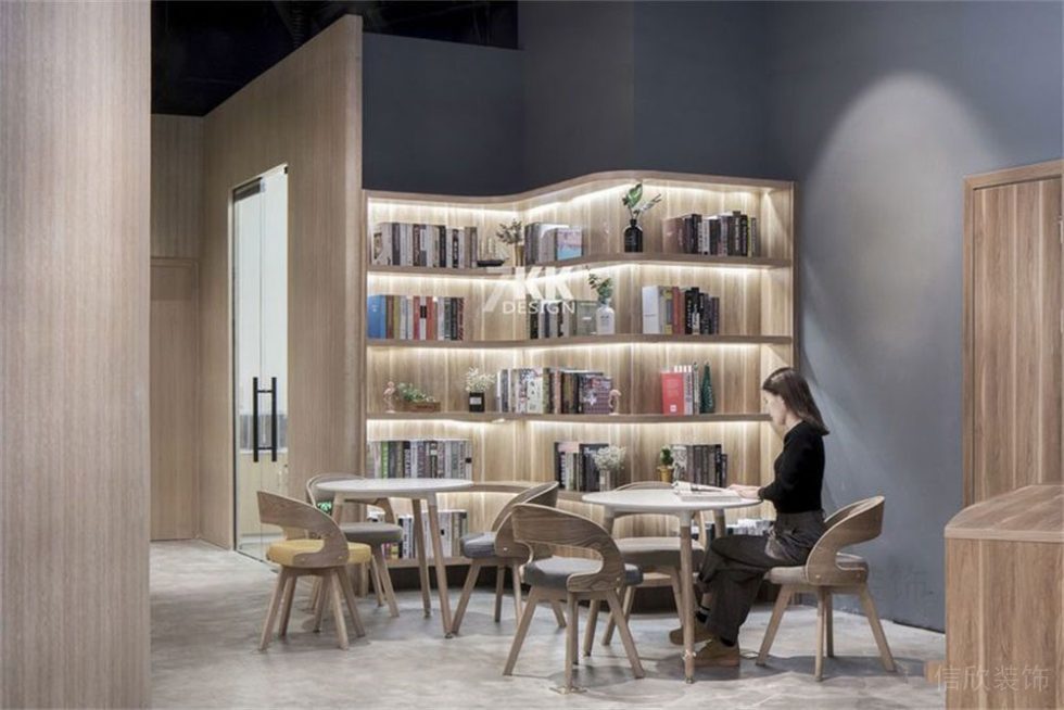 淺色的書柜代替背景墻的設計,在燈光的裝點下,明亮溫馨,思考和洽談的時候,更有一種原始自然的輕松感。