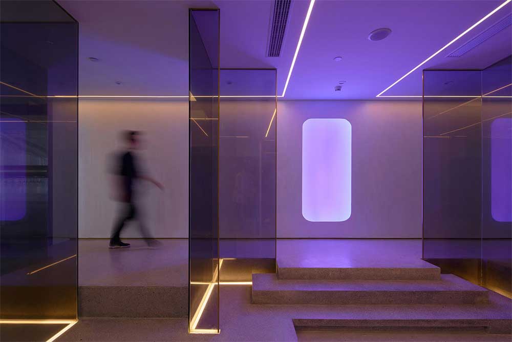 辦公室入戶,黑色半透明的玻璃,無規(guī)律的排列,在底部光影折射下,神秘而低調(diào)。