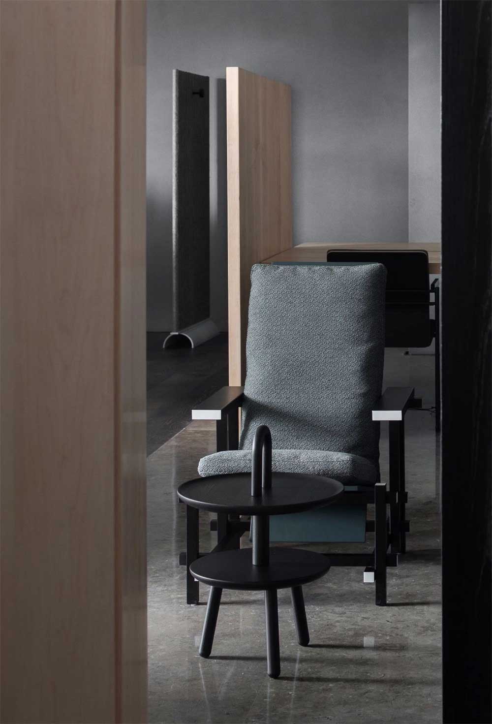 原木風(fēng)辦公室裝修設(shè)計(jì)灰色,灰色水泥澆筑和黑色長條形木板結(jié)合的會(huì)議室,原始粗獷,自然的設(shè)計(jì)理念。