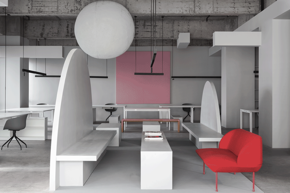 辦公區(qū)辦公空間頂面保留原本管道形式局部做吊頂設(shè)計(jì),地面采用水泥自流平設(shè)計(jì)。