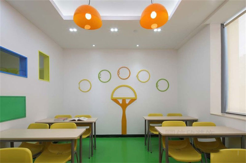 圓形的柱子,加上黃色的石膏板燈膜的設計,讓本來突兀的柱子,和教室融為一體,成了不可或缺的裝飾,既有設計特點,又不失美觀。