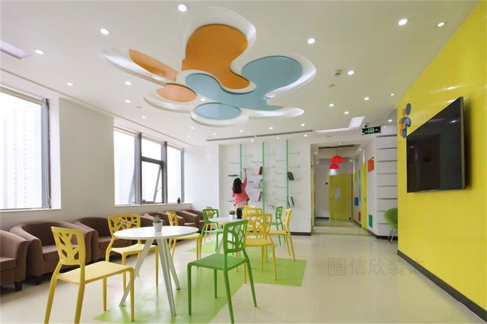 等候區(qū)采用一體式的石膏頂,加上鏤空的造型設計,如七色花一樣的閃耀,讓孩子對學校也充滿了向往和喜愛。