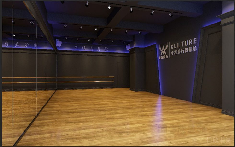 鋼管舞蹈室的設計,整體墻面的鏡子,讓學員學習中可以看到自己的動作,預留的鋼管,頂面的軌道燈等必要設備,藍紫色的燈光把整個空間猶如披上一道燃燒的火焰,激情四射。