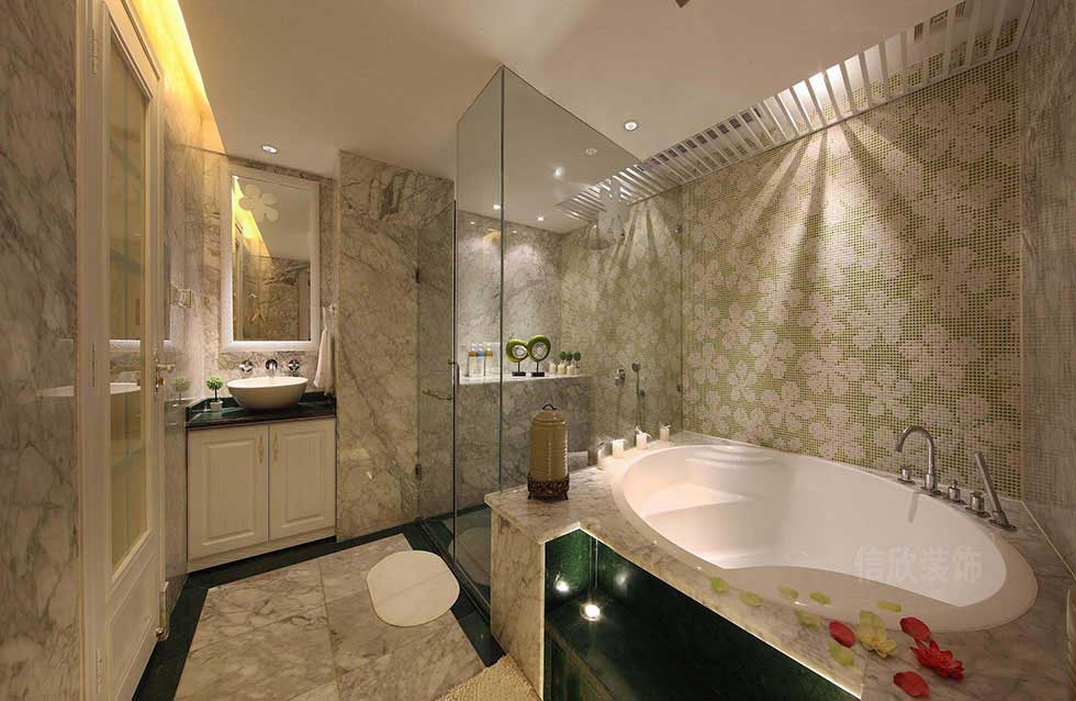 天然石材墻地一體的大理石運用,紋理豐富,特點鮮明,歐式風(fēng)格的洗手柜,綠色的天然大理石設(shè)計,高端和自然的結(jié)合,簡約中透出貴族般的格調(diào)和檔次。