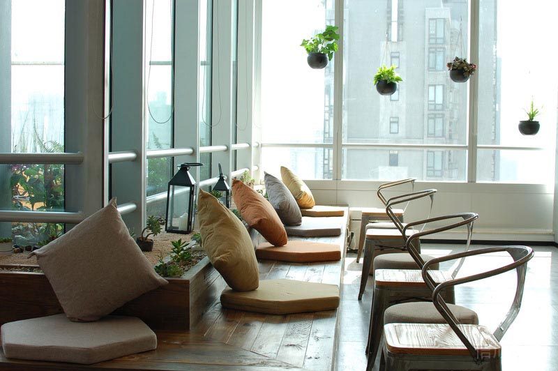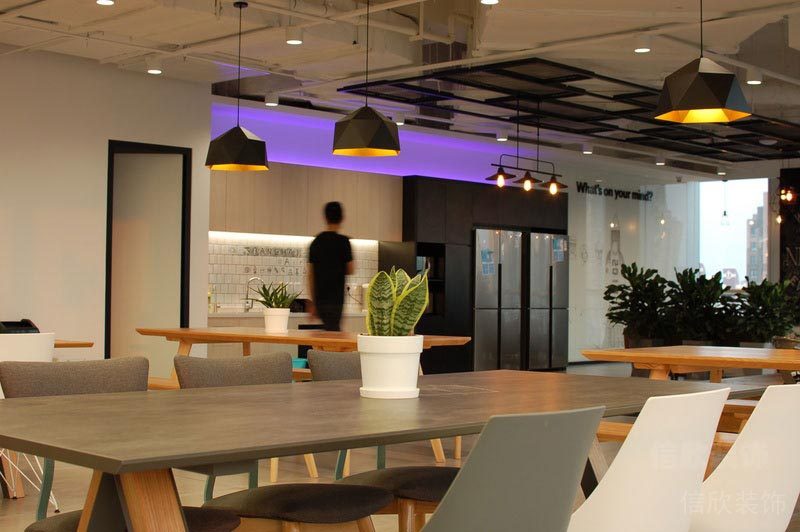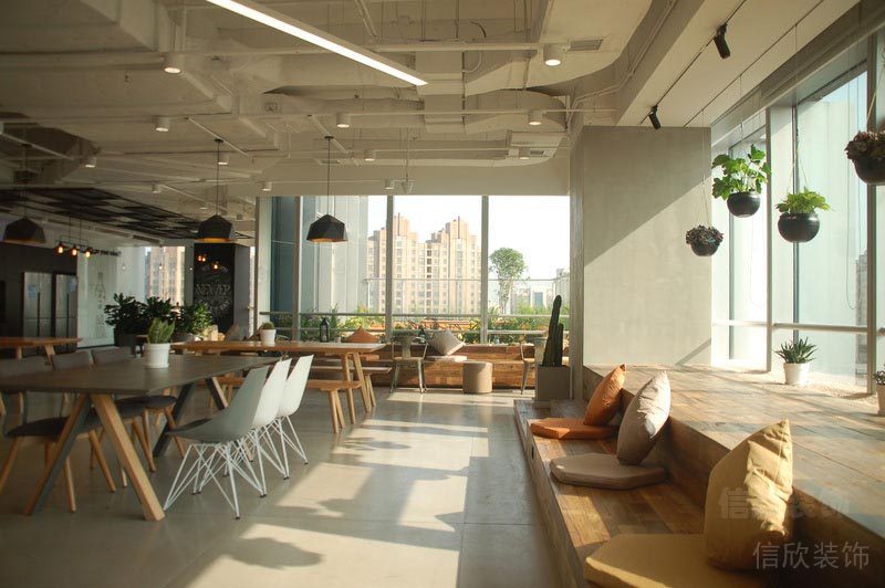 本案位于深圳市是一所田園風格的辦公室裝修設(shè)計案例,在墻面上大量使用玻璃墻,使空間的通透性強,人們可以通過玻璃看到窗外的世界,使辦公空間與室外自然環(huán)境在一定程度上達到相互融合。同時,室內(nèi)植物在陽光的照射下形成自然的光影,對辦公空間有一定裝飾性。