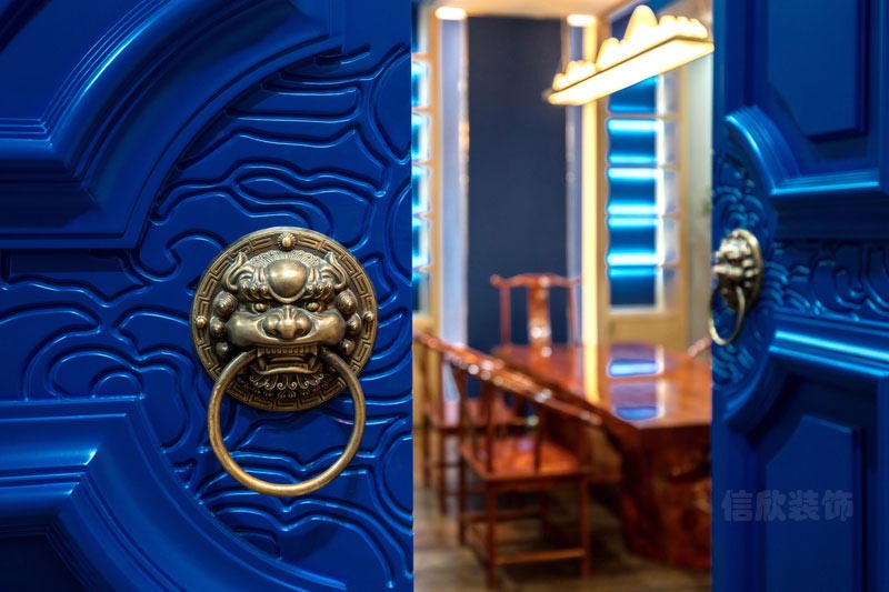 董事長室門兩旁內(nèi)外的傳統(tǒng)祥云文化圖騰,將門的兩邊造型統(tǒng)一了起來,將其作為一個整體。董事長室門是以不銹鋼線條為框,淺木紋飾面板為主體,與古典藍造型木相結(jié)合,加以古銅的虎獅造型的門叩,既延續(xù)了大門的古典氣質(zhì),與大門相呼應(yīng),又保留了隱私性。