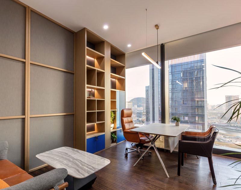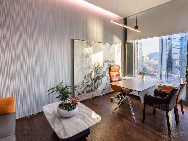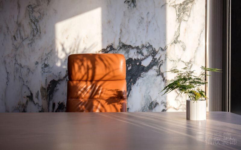 山水大理石背景及橘色辦公椅在夕陽下的照耀下,顯得格外迷人??捎诜泵笮蕾p窗外風光、待客會友,也是趣事。