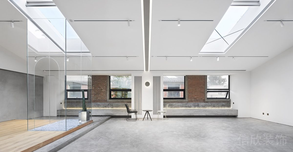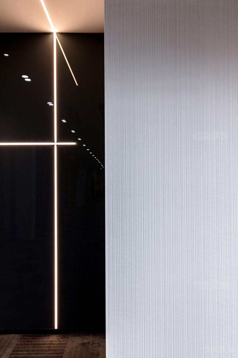 白色的光觸媒磁化板墻面與黑灰色的玻璃形成了黑白顏色對比強烈的效果,加以點綴線形的嵌入式燈條,更加突出了過道這一端景特別之處。靈活運用了點、線、面多種形式的表現(xiàn)方式,使得畫面黑、白、灰變化豐富,虛實層次錯落有致,疏密空白安排得體。