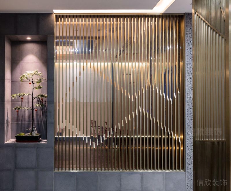 深圳南山現(xiàn)代中式風格辦公室的玄關(guān)觀景區(qū)高低起伏的不銹鋼造型隔斷,像是一座座連綿不斷的山巒,后面是通電玻璃,在透明情況下可以在觀景區(qū)通過玻璃看到外面的海景,將此處的視覺空間延伸出去,若打開通電玻璃開關(guān)則可關(guān)閉透明狀態(tài),保護了董事長室的隱私性,既達到視覺的通透性,又滿足了區(qū)域功能的劃分。不銹鋼隔斷在陽光的照耀下,通過反射可以將此處變成一處熠熠生輝的金屬風景。