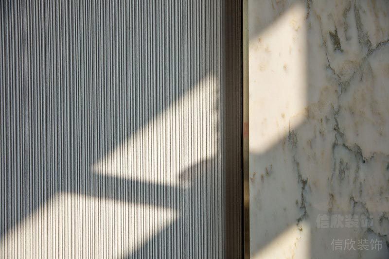 深圳南山現(xiàn)代中式風格辦公室玄關(guān)觀景區(qū)屏風局部的墻面則是用較現(xiàn)代但又不失古典的水泥石,既延伸了員工辦公區(qū)的現(xiàn)代風格,又不破壞入門過道空間的調(diào)性,保留了入門過道空間的完整性。董事長室門垛兩旁傳統(tǒng)祥云的文化圖騰,水景墻面豎貼的灰瓦,及三座白玉的石獅,極大豐富了空間的表情,更加增加了現(xiàn)代中式文化的氣息。
