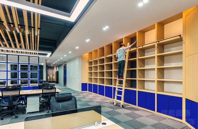 運用大面積的書柜,擴展空間的橫豎立體感和規(guī)整性,從而增添空間的時尚個性氣息;也極大增加了儲存空間。大面積的書架或是滿載富含知識的書籍,或是擺放精美的瓷器、藝術(shù)陳設(shè),或是擺放公司的榮譽證書等,這些物品都可以將公司的內(nèi)容和文化體現(xiàn)出來。